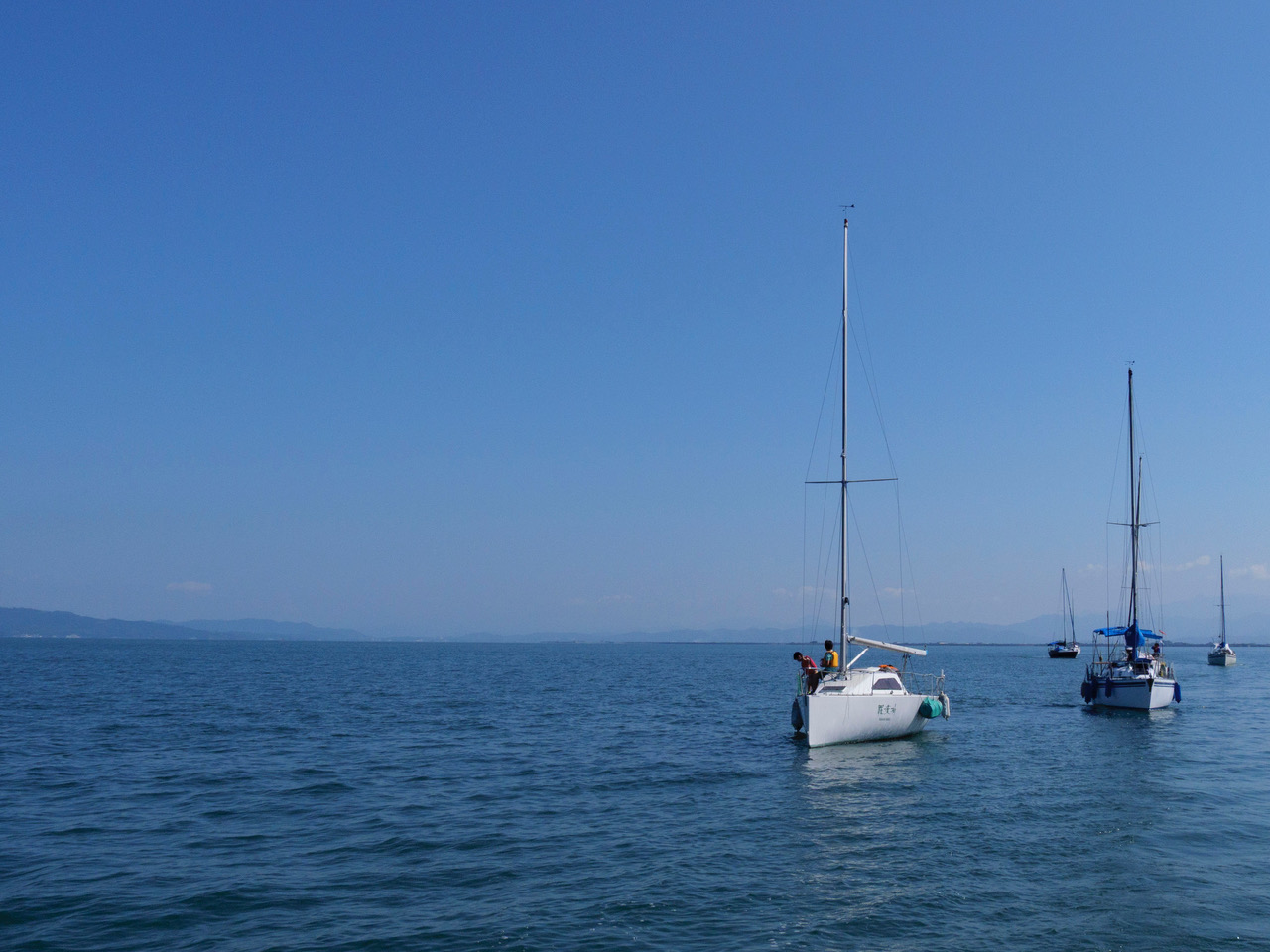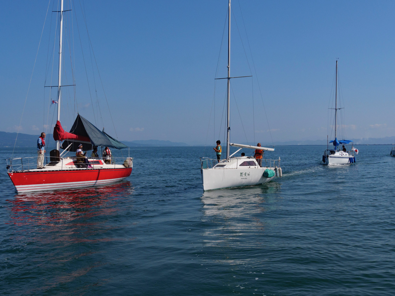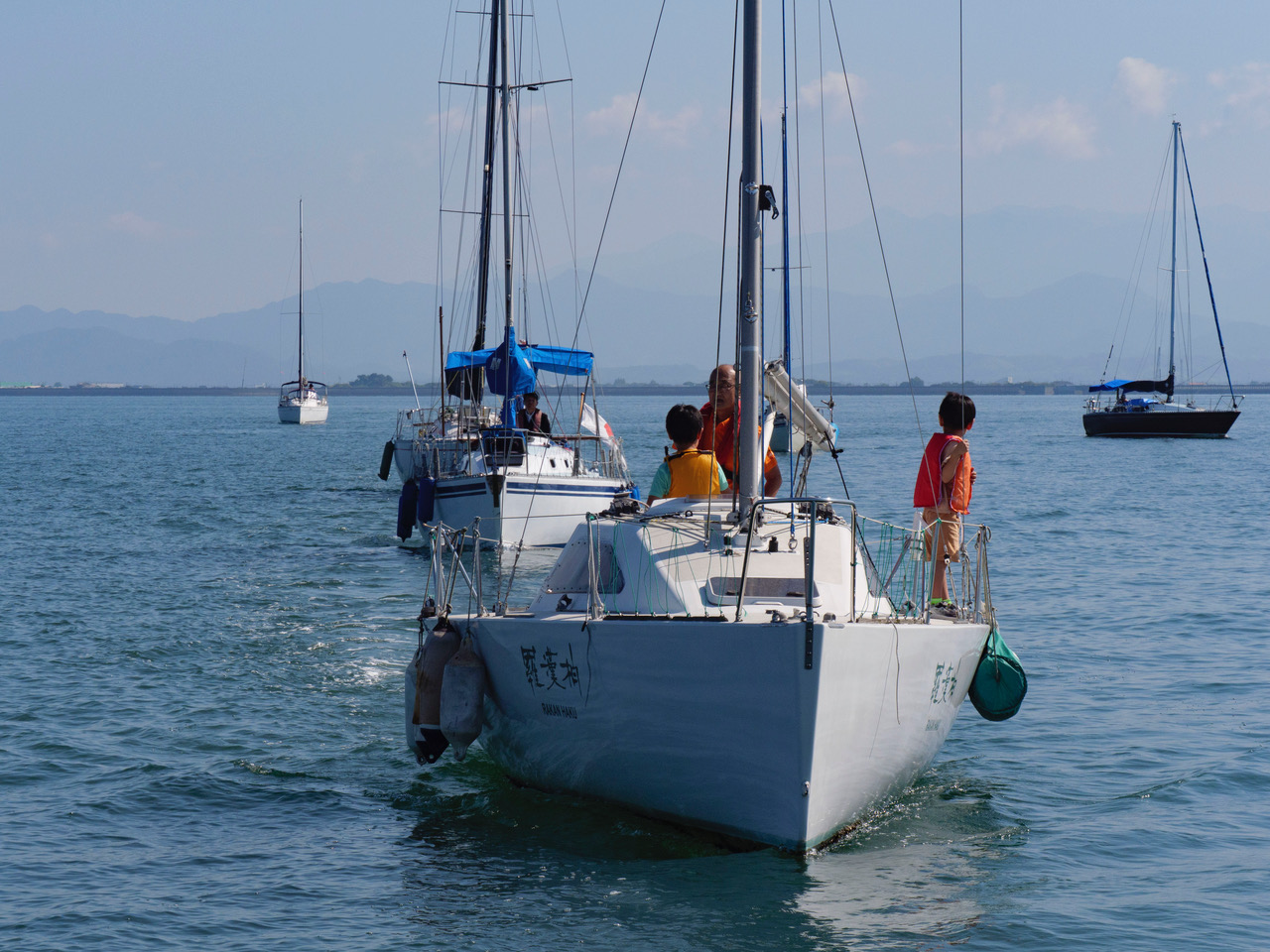 次々と港外で単縦陣になる、クラブ艇